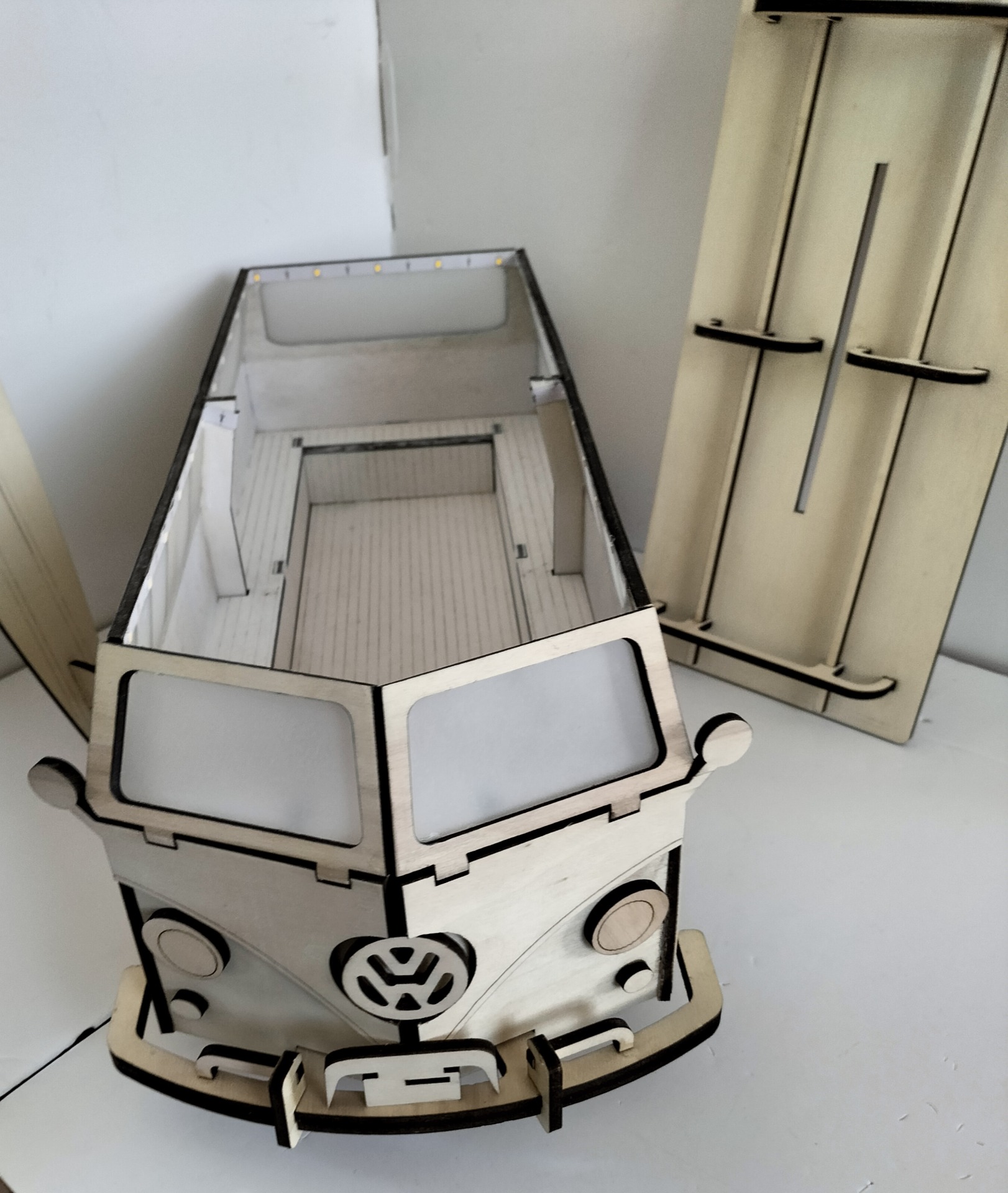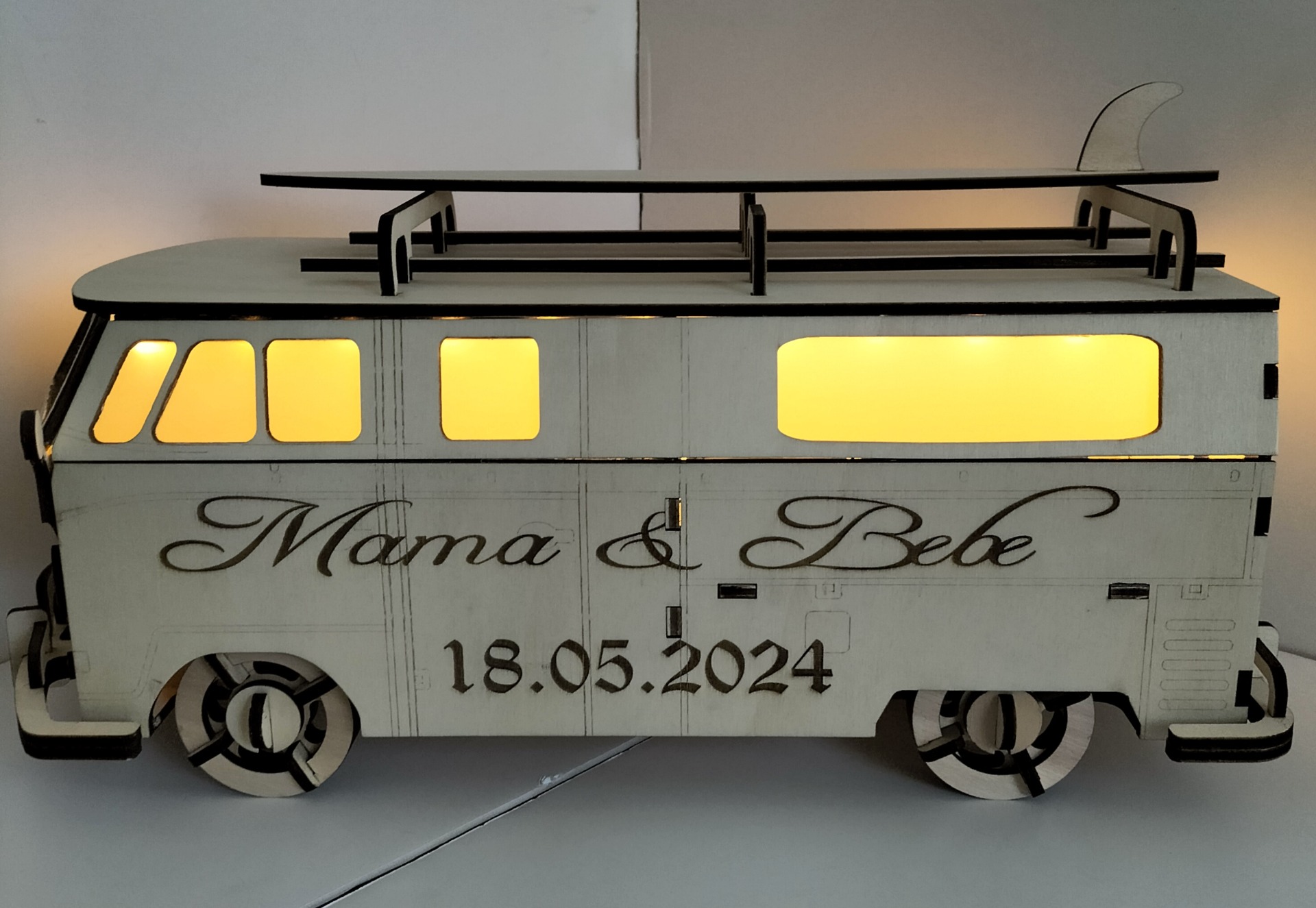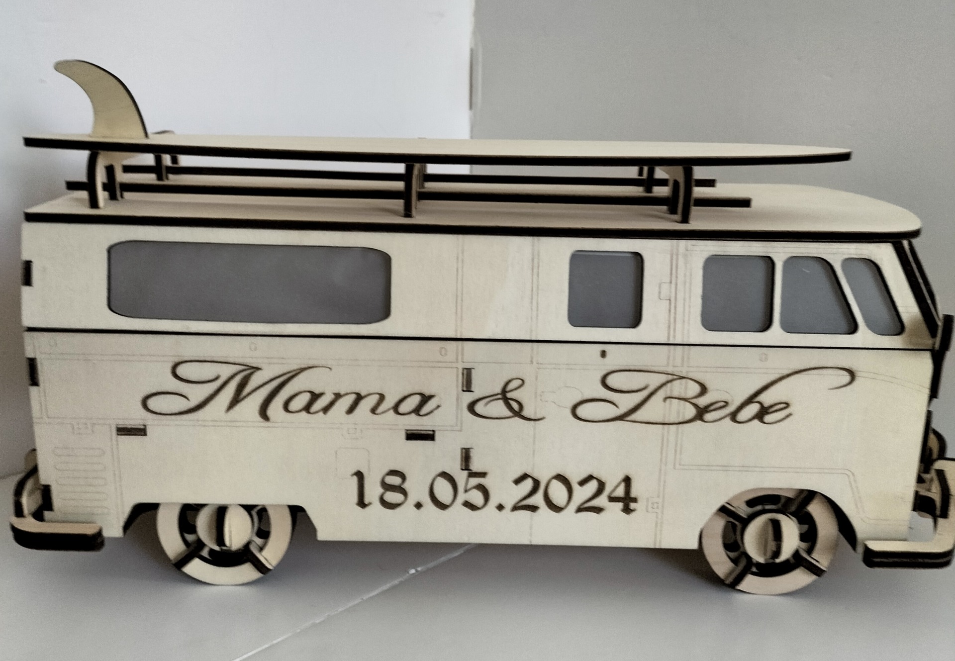 Combi VW modifié en urne , pour mariage où anniversaire , elle est personnalisable avec prénoms , dessins , texte, etc... Eclairage en plus sur demande